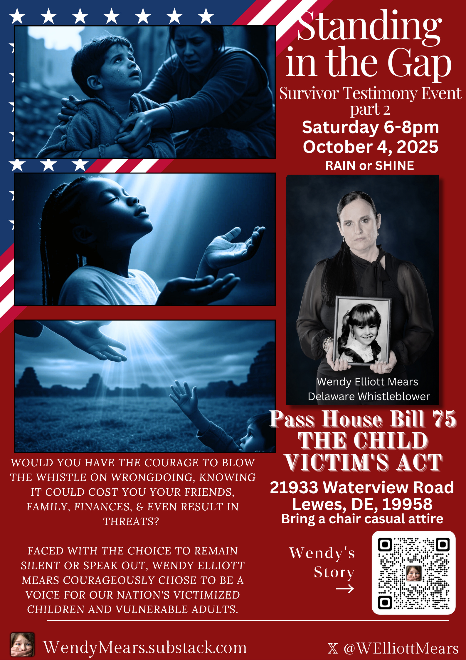 Below is the Previous Online Delaware Whistleblower Event held on April 19, 2024, which would be wise to view before Part 2 Delaware Whistleblower Survivor Testimony on Saturday 6-8 pm October 4, 2025, RAIN OR SHINE! This event will also be a platform to pass House Bill 75 THE CHILD VICTIM’S ACT. You can attend the event in person, and it will eventually be recorded and uploaded to this Substack platform.